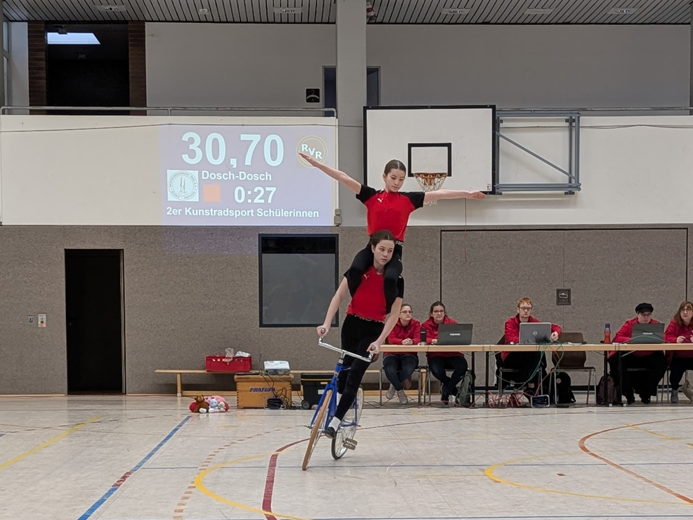 Der anschließende Start von Elenya gemeinsam mit ihrem Bruder Orlando im 2er war dann ein ganz besonderer Start. Schon in ihrem ersten Jahr im 2er, nach gerade einmal einem halben Jahr Training, hatten die beiden die Chance, sich für die Deutschen Meisterschaften zu qualifizieren. Hierfür war ein Sieg mit einer ausgefahrenen Punktzahl von mindestens 25,00 Punkten notwendig. Die einzige Konkurrenz – das Duo Voß-Vietor aus Worms – legte mit einer ordentlichen Darbietung vor und erhöhte den Druck auf das Finther Geschwister-Paar. Elenya und Orlando blieben konzentriert und starteten ebenfalls ordentlich. Spannenden Minuten liefen von der Uhr bis es 25 Sekunden vor Schluss passierte – der Sturz, den alle Kunstradfahrer fürchten. Schade, denn am Ende reichte es damit nicht für den Sieg. 22,80 (34,30) ausgefahrene Punkte bedeuten jedoch den Vize-Landesmeister-Titel. Wir gratulieren dem Wormser 2er zum Titel und wünschen viel Erfolg für die Deutschen Meisterschaften, die am 25. und 26. Mai in ihrer Heimatstadt stattfinden.